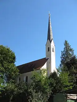 Die barocke Saalkirche wurde um 1680 nach einem Entwurf von Hans Kogler erbaut. Sie besteht aus dem Langhaus, dem eingezogenen, dreiseitig geschlossenen Chor im Osten und dem halb in das Langhaus im Westen eingestellten Kirchturm. Sein oberstes Geschoss enthält den Glockenstuhl. Zwischen den Giebeln erhebt sich ein spitzer Helm.