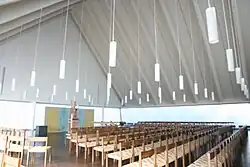 Im Kirchengebäude von 1973 wurden die ursprünglichen Gemeinderäume bei der Neugestaltung von 2016 bis 2017 rückgebaut, sodass die Kirche, ohne dass dies äusserlich sichtbar wäre, erweitert werden konnte und nun den ganzen Raum des Gebäudes einnimmt. Die im Erdgeschoss hinter der ursprünglichen Chorwand vorhandene Werktagskapelle wurde hierbei unter die Orgelempore verschoben und ist durch Türen mit der Kirche verbunden. Bei der Neugestaltung der Kirche durch die Architekten Susann Vécsey und Christoph Schmidt blieb die Formgebung von 1973 erhalten, wurde aber mit einer neuen Farbgebung aufgehellt. Die Dachkonstruktion bildet mit dem Boden des Raums ein Dreieck und erinnert damit an die Dreifaltigkeit. Ein dunkler Parkettboden betont den festlichen Charakter des Kirchenraums. Der Altarraum wurde 2017 von Maria Jesus Fernandez, Aldenhoven neugestaltet. Volksaltar und Ambo wurden restauriert und durch einen neuen Osterkerzenständer sowie ein Vortragekreuz ergänzt. In die neue, dreiteilige Chorwand ist in der Mitte eine Eichensäule mit dem Tabernakel eingelassen. Die Säule erinnert an den Hl. Franziskus, der in einer Vision von Papst Innozenz III. die einstürzende Kirche stützt.[14]