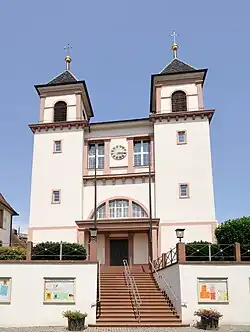 Die beiden Türme flankieren den dreigeschossigen Hauptkörper der Kirche, dessen Vorbau mit einem Konsolengesims nach oben abgeschlossen ist und in dessen oberen Drittel zwischen zwei größeren Rechteckfenstern eine Uhr angebracht ist. Der Innenkreis des Zifferblatts ist hellblau, der äußere Kreis zum Kontrast schwarz. Die Zeiger und die römischen Zahlen sind goldfarben. Die Glockengeschosse der Türme springen leicht zurück und sind mit Eckpilastern und rundbogigen Langarkaden versehen. Die beiden Türme haben Pyramidendächer und tragen goldene Turmkugeln und Kreuze. Eine Treppe im Nordturm führt zum für die Öffentlichkeit nicht zugänglichen Glockengeschoss. Im leicht zurückspringenden Mittelteil der Fassade befindet sich eine verglaste Rundbogenöffnung. Zwei rechteckige Fenster über einem Konsolengesims im Obergeschoss sind von Eckpilastern gerahmt. Der Mittelteil wird von einem Satteldach abgeschlossen. Der Eindruck der Gedrungenheit wird durch die zurückgesetzten Gliederungselemente und Bauteile im Mittelteil erreicht. Dieser Stil ist sowohl für Christoph Arnold als auch für andere Bauwerke aus der Weinbrennerzeit typisch.[16]