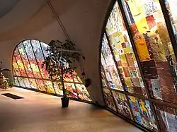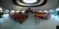 Bei dem Kirchengebäude handelt es sich um eine moderne Rundkirche mit separatem Turm. Die Kuppel des Baus ruht auf 12 Stützen.[5] Die 12 halbkreisförmigen Betonglasfenster gestaltete der Künstler August Deppe aus Homburg. Der Mosaikfußboden wurde 1964 von der Firma Villeroy & Boch (Mettlach) verlegt.[3]