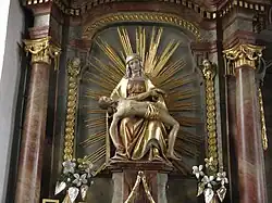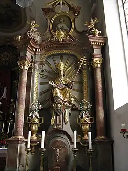 Der Hochaltar ist dem Kirchenpatron St. Gallus geweiht. Dieser ist zentral über dem Tabernakel in einer Figur dargestellt,[4] die von Skulpturen des hl. Urban und des hl. Sebastian flankiert wird.[3] Der linke Seitenaltar ist der Schmerzhaften Muttergottes geweiht und zeigt eine um 1500 entstandene Pietà. Der rechte Seitenaltar trägt ein Bildnis des hl. Papstes Silvester.[3] Die klassizistischen Altäre wurden Anfang des 19. Jahrhunderts gefertigt.[4]