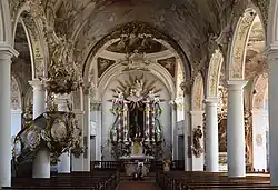 Es handelt sich um einen dreischiffigen Bau mit dem Charakter einer Basilika. Beiderseits am Langhaus sind zwei halbrunde Seitenkapellen angesetzt. Große Rundbogenfenster bringen Licht ins Langhaus und in den Chor. Dem barocken Zeitgeschmack entsprechend dominieren Rundbögen den Raum. Ein Tonnengewölbe bildet die Decke des Mittelschiffs. Beiderseits des Chors im Osten befindet sich rechts und links eine Sakristei. Oberhalb der beiden Sakristeiräume befinden sich die beiden Emporen für die Fürstenhäuser. Überdeckt wird der Chor von einer fast 8 m weiten Flachkuppel.[9]