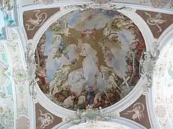 Im Deckenfresko über dem Hochaltar ist die Geburt Christi mit der Anbetung der Hirten dargestellt. In der Flachkuppel des Chors gibt sich Christus in der Kommunion den Aposteln zur Speise. Am unteren Rand sind die Allegorien von Glaube, Hoffnung und Liebe dargestellt sowie die Unschuld mit einem Einhorn. In den Zwickeln halten Engel Bänder mit Texten aus der Hymne Tantum ergo. Links über den Oratorien ist die Himmelfahrt Christi und rechts die Herabkunft des Heiligen Geistes zu sehen.[18]