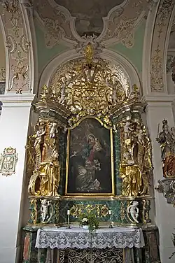 1736–1737 fertigte der Schreiner Michael Bertele den Hochaltar. 1738–1741 malte Judas Thaddäus Sichelbein die fünf Altarbilder. Die beiden Seitenaltäre entstanden 1743 in der Werkstatt von Hans Michael Weißenhorn.[4]