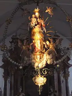 Der Chorraum birgt die bedeutendsten Kunstwerke der Kirche. Über dem Eingang zur Sakristei ist die Muttergottes von Jörg Lederer aufgestellt. Die Madonna (um 1520) steht auf der Mondsichel und bietet den Jesusknaben dar. Im Chorbogen hängt die große Rosenkranzmadonna von 1641. Das gotisierende Werk entstand wohl in einer Weilheimer Werkstatt. Südlich des Hochaltars haben sich die Außenflügel eines spätgotischen Flügelaltars mit Darstellungen der Vierzehn Nothelfer und der Verkündigung erhalten (ca. 1520).