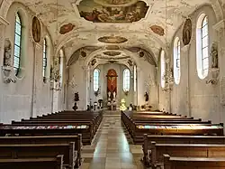Der im Kern spätmittelalterliche Saalbau mit eingezogenem Chor und nördlichem Turm mit Zwiebelhaube ist von einer ehemaligen Friedhofsmauer, die im Norden und Osten mit Stichbogenblenden aus dem 17. bis 18. Jahrhundert versehen ist, umgeben. Das neue Deckengemälde Mariae Himmelfahrt schuf Johann Georg Wolker,[3] die Stuckarbeiten im Chor stammten von Franz Xaver Feichtmayer d. Ä. und im Langhaus wohl von Andreas Hainz.