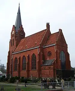 Der Westturm auf quadratischem Grundriss hat an den Ecken abgetreppte Strebepfeiler und wird durch zwei umlaufende Gesimse gegliedert. Das große spitzbogige, abgestufte Westportal dient als Haupteingang. Darüber ist eine Fensterrose eingelassen. Süd- und Nordseite sind fensterlos. Oberhalb des zweiten Gesimses, in Höhe der Traufe des Schiffs, sind an den drei freistehenden Seiten kleine spitzbogige Öffnungen und im Obergeschoss je zwei größere Schallöffnungen für das Geläut eingelassen. Den Abschluss des aufgemauerten Turms bildet ein achteckiger Fries mit kleinen Blendnischen, dem vier Dreiecksgiebel mit je einer großen spitzbogigen Blendnische aufgesetzt sind. Während in die östliche Blendnische vier Kreisfelder eingelassen sind, tragen die anderen drei Blendnischen die beleuchteten Zifferblätter (1961) der Turmuhr.[12] Aus den vier Giebeln entwickelt sich der oktogonale, verschieferte Spitzhelm, der von einem Turmknauf, einer Wetterfahne und einem vergoldeten Wetterhahn (1996) bekrönt wird.[13]