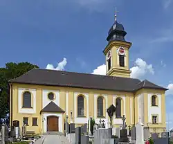 Die erstmals im Jahr 778 als oratorium erwähnte Pfarrkirche wurde in den Jahren 1729–1732 neu erbaut, wobei ein Turmunterteil eines spätgotischen Vorgängerbaus mit Gratgewölben im Erdgeschoss und Spitzbogenöffnungen zum Chor mit einbezogen wurde. Der Baumeister des 1734 geweihten Bauwerks war Johann Georg Ettenhofer aus München. Im Jahr 1954 wurde das Langhaus verlängert; eine Renovierung wurde 1976/1977 vorgenommen. Wegen herabfallendem Deckenputz musste ein Netz zum Schutz der Personen in der Kirche ausgespannt werden (Stand 2021).