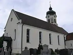 Die Saalkirche wurde 1709 durch die Abtei Weingarten errichtet. Sie besteht aus einem Langhaus, einem eingezogenen, dreiseitig geschlossenen Chor im Osten und einem erhalten gebliebenen gotischen Chorflankenturm auf quadratischem Grundriss an dessen Nordwand, der mit einer Zwiebelhaube bedeckt ist. Im Erdgeschoss befindet sich die Sakristei, die an dieser Stelle 1907 aufgegeben wurde. Sein oberstes achteckiges Geschoss erhielt er 1926, das hinter den Klangarkaden an vier Seiten den Glockenstuhl beherbergt. Darüber befinden sich die Zifferblätter der Turmuhr.