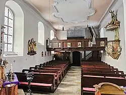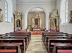 Die verputzte Saalkirche wurde 1758–60 anstelle einer Kapelle aus dem 14. Jahrhundert gebaut. Sie besteht aus einem Langhaus mit drei Jochen und einem eingezogenen, gerade geschlossenen Chor im Osten. Aus dem Satteldach des Langhauses erhebt sich im Westen ein quadratischer, mit einer Welschen Haube bedeckter Dachreiter, dessen oberes Geschoss die Turmuhr und den Glockenstuhl beherbergt. Das Portal liegt heute an der Westseite des Langhauses, das ehemalige an der Südseite ist vermauert. Die Orgel wurde 1900 von Johann Wolf erbaut.