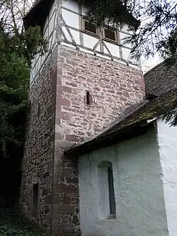 Neuenbürg St. Georg Turm aus Bruchsteinmauerwerk mit Eckquaderung romanische Basis