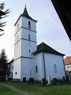 Der Chor und der über der Sakristei an seiner Südseite stehende Chorflankenturm wurde 1492 errichtet. 1734 wurde das Langhaus im Westen des eingezogenen Chors erneuert und dabei Emporen eingebaut. Der Chorflankenturm wurde aufgestockt, um die Turmuhr und den Glockenstuhl unterzubringen, und mit einem achtseitigen Knickhelm bedeckt. Die historischen drei Kirchenglocken wurden im Ersten Weltkrieg abgeliefert und wurden danach durch Gussstahlglocken ersetzt. Erst 1989 wurden wieder Glocken aus Bronze angeschafft.[1] Der Innenraum des Chors ist mit einem Kreuzrippengewölbe überspannt.