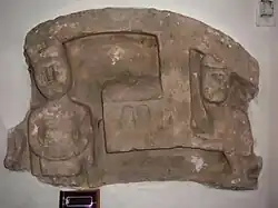 An der südlichen Chorraumwand ist innen neben dem Eingang zur Sakristei ein frühgotisches, „sehr rohes“[11] Steinrelief wohl aus dem 13. Jahrhundert eingemauert, das als Rest eines Tympanons der Vorgängerkirche angesehen wird und wahrscheinlich den Kirchenstifter zeigt, wie er den Sakralbau dem Bischof oder dem Kirchenpatron darbringt. Das Relief befand sich an der alten Kirche an der südlichen Außenmauer.[12]