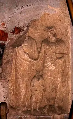 Im Erdgeschoss des Turmes ist in die östliche Innenwand ein teilweise zerstörter römischer Grabstein ohne Inschrift eingemauert, der drei Relieffiguren (Ehepaar mit Kind?) zeigt.
