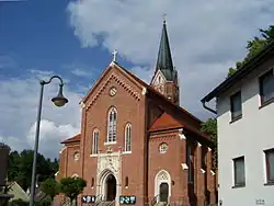Der unverputzte Backsteinbau ist außen durch einmal abgesetzte Strebepfeiler entlang des Chores und der Seitenschiffe, einen umlaufenden Sockel und einen Spitzbogenfries gegliedert. Letzterer tritt an Mittelschiff und Chor deutlicher hervor. Die Westfassade mit dem zweiflügeligen Hauptportal und den beiden mit Kupfer verkleideten Seitenportalen wird von einem Kreuz auf dem Dachfirst bekrönt. Alle drei Portale sind spitzbogig ausgeführt und besitzen gestufte Gewände, das Hauptportal ist mit Fialen und Kreuzblumen bekrönt. Die ebenfalls spitzbogigen, zweibahnigen Maßwerkfenster sind mit Vierpassornamenten verziert.[5]
