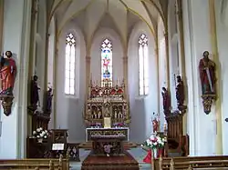 Der neugotische Hochaltar enthält einen vergoldeten Tabernakel mit Aussetzungsnische, der von kleinen Figuren (von links nach rechts) des Abraham, Michael, Nikolaus und Melchisedech in entsprechenden Nischen flankiert wird. Darüber befindet sich eine reliefartige Darstellung Jesu und der zwölf Apostel beim letzten Abendmahl. Der Altar ist mit zahlreichen Fialen verziert, die allesamt von Kreuzblumen bekrönt sind.[5]