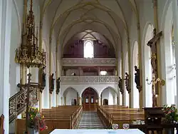 Der Innenraum wird von neugotischen Sterngewölben mit runden Schlusssteinen überspannt. Deren birnstabförmige Rippen entspringen aus halbrunden Wanddiensten mit profilierten Kapitellen. Ansonsten sind die Wände ohne Gliederung. Der Chorbogen, die Schildbögen und die Übergänge zwischen den Schiffen sind spitzbogig ausgeführt. Die mächtigen Pfeiler, die die drei Schiffe trennen, sind an den Kanten gefast. Da es sich um eine Pseudobasilika handelt, ist kein Obergaden vorzufinden. Der Altarraum ist gegenüber dem Langhaus um drei Stufen erhöht. Das westliche Langhausjoch wird in der ganzen Breite von einer Doppelempore überspannt, deren Brüstungen mit neugotischem Blendmaßwerk verziert sind. Auf dem oberen Emporengeschoss ist die Orgel untergebracht. Der Zugang zu den Emporen erfolgt über zwei Wendeltreppen, die zu beiden Seiten des Hauptportals angeordnet sind.[1][5]