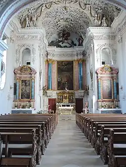 Der Architekt und Stuckateur der Kirche ist nicht dokumentiert; es gilt jedoch als sicher, dass es sich hierbei um Johann Schmutzer, einen der Begründer der Wessobrunner Schule handelt. Die erhabenen Stuckaturen setzen sich an der Decke bis zu 40/50 cm vom Hintergrund ab. Sowohl Kanzel als auch Hochaltar sind Bestandteil der Wandarchitektur. Das Altarblatt zeigt den Heiligen Wandel mit Gottvater und Heiligem Geist. Die Seitenaltäre sind dem hl. Sebastian (links) und dem hl. Antonius (rechts) geweiht.[1] Die Altarblätter werden Johann Reismiller (1697) aus Friedberg zugeschrieben. Die ursprünglichen Fresken wurden 1873 von Josef Kober durch neue Malereien ersetzt, welche nach dem Krieg wiederum entfernt und durch Fresken des Gögginger Malers Hummel ersetzt wurden. 2003 wurden diese dann durch Malereien von Franz Kugelmann ersetzt, welcher an die barocke Tradition anknüpfte.[2]