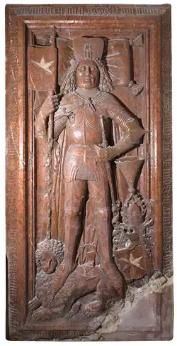 • Auf dem in die Wand eingelassenen Grabstein von 1572 ist das verstorbene Ehepaar dargestellt, das von Engeln zur Himmelsleiter geführt wird, wo es von Gottvater erwartet wird. Die Reliefdarstellung wird von zwei Hermen flankiert und von einem Ziergiebel mit einer Engelsputte bekrönt. Unter dem Grabstein ist eine aufwändig gerahmte Tafel mit einer Inschrift angebracht.