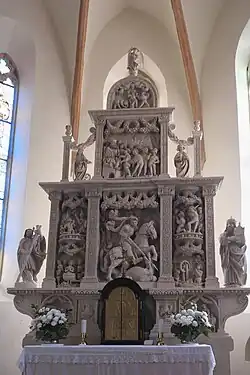 Bedeutendstes Ausstattungsstück der Kirche ist der aus einem weißen Sandsteinblock gemeißelte Hauptaltar im Stil der frühen Renaissance, der vermutlich um 1527 angefertigt wurde. Er ist dem Schutzpatron der Kirche, dem heiligen Georg, geweiht und stellt Szenen seiner Legende dar. Die zentrale Szene zeigt den heiligen Georg, wie er seine Lanze einem Drachen ins Maul stößt. Die seitlichen Szenen sind seinem Martyrium gewidmet.