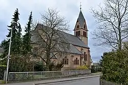 Man errichtete eine neuromanische Pseudobasilika nach den Plänen des Mainzer Kirchenbaumeisters Ludwig Becker. Die Außenwände bestehen aus hellbraunen Bruchsteinen mit Gliederungen aus rotem Sandstein. Die Dächer sind mit Schieferplatten gedeckt. Im Innern sind die Wände verputzt und weiß gestrichen, die Rundbögen und Säulen sind farblich akzentuiert. Das nach Südosten ausgerichtete Kirchenschiff ist von einem Querschiff durchschnitten und hat ein Kreuzgratgewölbe. Das Hauptschiff endet mit dem Chorraum in einer breiten Apsis. Sie ist mit sieben Fenstern und darunter mit einem Rundbogenfries gestaltet. Am anderen Ende des Hauptschiffs befindet sich eine Empore mit der Orgel. Das Querschiff geht in zwei Seitenschiffe über. Diese sind durch Pfeilerarkaden vom Hauptschiff getrennt und besitzen ebenso Apsiden. Der 36 Meter hohe Kirchturm steht vor dem Hauptschiff und hat ein spitz zulaufendes rautenförmiges Dach.