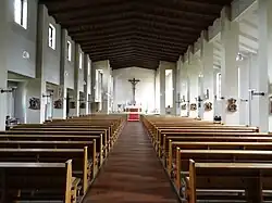 Der schlicht gestaltete Innenraum wird von einer Holzbalkendecke mit flachem Giebel abgeschlossen. Der östliche Altarbereich ist um sechs Stufen erhöht. Hinter dem Altar ist der kubusförmige Tabernakel auf einem Unterbau aus Gelbsandstein, den Karl-Heinz Krebs behauen hatte, aufgestellt. Die mächtige Altarplatte ruht auf drei massiven Sandsteinstützen. Eingesenkt sind Reliquien von vier Heiligen (St. Pius, St. Vigilans, St. Aucta und St. Gottfried).[20] Ursprünglich stand der Tabernakel auf dem Altar, bis dieser 1978 infolge der Liturgiereform vorgerückt wurde. Schwester Agape Thielen von der Abtei Herstelle schuf den Tabernakel 1954. Seine beiden Fronttüren sind aus Kupfer- und Silberplatten gefertigt und zeigen Elias mit einem Engel. Dieser reicht dem Propheten ein Brot mit den Worten: „NIMM UND ISS, DEIN WEG IST WEIT“, die hier auf die heilige Kommunion bezogen werden.[21] Familie Hermann Josef Abs stiftete dem Bistum Mainz eine moderne Monstranz mit einem entsprechenden Kelch, die der Bischof der Gemeinde überließ. Hinter und über dem Altar wird die Ostwand von einem überlebensgroßen hölzernen Kruzifix des Dreinageltypus beherrscht, das der Bildhauer Heinrich Wohlfahrt aus Steinheim für den Kirchenneubau anfertigte. Kanzel, Taufbecken, Weihwasserbecken, Steinschalen und Teile der Kommunionsbank wurden von Karl-Heinz Krebs aus Sandstein gemeißelt.[22] An den Pfeilern des Mittelschiffs sind moderne, geschnitzte Holzplastiken mit den Kreuzwegstationen (1953) angebracht, die ebenso wie die Weihnachtskrippe (1956) und Fatima-Madonna (1957) von Wohlfahrt geschnitzt wurden.[23] Das schlichte hölzerne Kirchengestühl von der Schreinerei Albrecht Ebner lässt einen Mittelgang frei. Kunsthandwerklich begabte Insassen der Butzbacher JVA entwarfen verschiedene Inventarstücke aus Schmiedeeisen und führten diese aus: Geländer, Kerzenständer, Wandarme der Zwölf-Apostel-Kerzen und die Seitenleuchter mit dem Bibelwort aus Joh 8,12  in lateinischer Sprache.[24]
