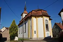 Die Saalkirche wurde 1721 nach einem Entwurf von Carl Friedrich von Zocha im Markgrafenstil gebaut. Sie besteht aus einem Langhaus, das mit einem Mansardwalmdach bedeckt ist, einer eingezogenen, als Konche angelegten Apsis im Osten und einem Fassadenturm im Westen, der mit dem Stumpf eines Pyramidendaches bedeckt ist, auf dem eine Laterne sitzt. Der Innenraum des Langhauses ist mit einem Tonnengewölbe überspannt, der der Apsis mit einer Kuppel, unter der die Orgel auf einer Empore steht. Zur Kirchenausstattung gehören ein Altar aus dem frühen 19. Jahrhundert und die um 1721 gebaute Kanzel.