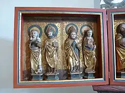 Wertvollster Einrichtungsgegenstand ist der gotische Flügelaltar aus den 1510er Jahren in der rekonstruierten Form von 1989/90. Nicht erhalten sind die Schleierbretter und die Profilleisten. Die originale Predella wurde im 17. Jahrhundert neu gefasst und zeigt die Abendmahlsszene. Die Rückseite des Mittelschreins und die Außenseiten der Flügeltüren weisen beschädigte Tafelmalereien aus spätgotischer Zeit mit weiblichen Heiligen als Halbfiguren auf, darunter die heilige Ottilie.[7] Die Innenseiten beherbergen 14 Schnitzfiguren, von denen aufgrund der entfernten Attribute nur einige sicher zu deuten sind. Sieben Figuren stehen im 1,60 Meter × 0,70 Meter großen Mittelfeld, von links nach rechts: Simon Zelotes, Jakobus der Ältere mit Hut, ein Heiliger mit Buch, Simon Petrus (?), ein Heiliger mit später ergänztem Buch und Palmwedel, ein Heiliger mit einem Beutelbuch und ein Heiliger mit Buch (Johannes?). Der linke Flügel zeigt vier Figuren: Elisabeth (Tuch mit Krone, Krug und Bettler), Nikolaus mit dem Bischofsstab und drei Klumpen auf dem Buch, einen Bischof mit Palmwedel und Amalberga. Auf dem rechten Flügel sind drei Figuren zu sehen, eine bekrönte Heilige ohne Attribut, ein Heiliger mit einem Beutel (Matthäus?) und rechts Georg mit dem Drachen.[8]