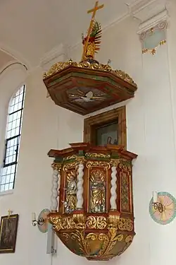 Die Kanzel (um 1700) zeigt am Korpus zwischen gedrehten Säulen in Muschelnischen Darstellungen der vier Evangelisten.
