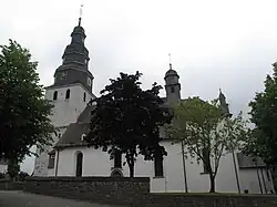 Unter den Stadtbränden, durch welche die Kirche stark beschädigt wurde, war der schlimmste der vom Jahr 1519. Unabhängig davon wurde der quadratische Turm im Westen der Kirche 1708/09 auf einem alten Sockel neu errichtet. Abgeschlossen wird er von einer dreifach gestuften, achtseitigen Barockhaube, einem Werk des Hallenberger Meisters Konrad Hesse, der auch Arbeiten in Eversberg, Wormbach und Hesborn durchführte. Über den beiden Ecken des Chors finden sich auf dem Kirchendach kleinere Entsprechungen des Hauptturmes. Die quadratische Grundfläche des Turms ist nur wenig kleiner als die Grundfläche des Chors und ist etwa 6 Meter mal 6 Meter groß.