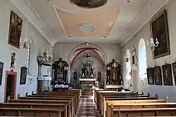 Von der Ausstattung aus der Zeit des Neubaus des Kirchenschiffs im 18. Jahrhundert haben sich drei Altäre erhalten, die 1732 geweiht wurden. Es handelt sich um zwei Seitenaltäre, von denen heute der eine als Marienaltar und der andere als Herz-Jesu-Altar dient und um einen Hochaltar. Von der ehemaligen Kanzel der Kirche blieben die Füllbretter mit den vier Evangelisten erhalten, die heute an den Seitenwänden im Altarraum angebracht sind. Von der ehemaligen Kommunionbank fanden zwei Fragmente im Kirchengestühl wieder Verwendung. Die Figuren in den Nischen der Altäre wurden 1893 angeschafft. Der plastische Aufbau auf dem Hochaltar wurde nach dem Zweiten Weltkrieg ergänzt[4].