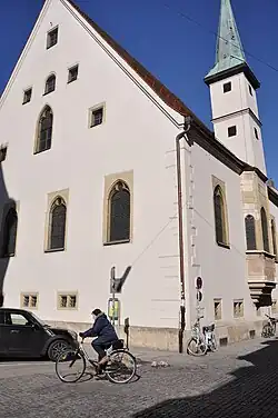 Die Kirche hat ihren Ursprung um 1445.[1] Das Kirchengebäude verdankt seine Entstehung der Gründung der Bruderhausstiftung, die 1444 durch die Vereinigung von zwei bürgerlichen, wohltätigen Stiftungen entstanden war. Vereinigt wurden die Stiftung des reichen Bürgers Stephan Notangst, der das sogenannte Bruderhaus am Haidplatz[2] für verarmte alte Handwerker zur Verfügung gestellt hatte, mit der Kastenmayer-Stiftung des reichen Bürgers Hans Kastenmeyer, der 1444 das Anwesen am Eck von Oberer Bachgasse und Emmeramsplatz aufgekauft hatte, um dort nach dem Umbau des Anwesens zum neuen Bruderhaus ebenfalls verarmte Handwerker unterzubringen. Unentgeltlich aufgenommen wurden Brüder, die zu leichten Arbeiten verpflichtet waren, während sich Pfründner einkaufen mussten und nicht arbeitspflichtig waren. Nach der Reformation 1542 wurde das Bruderhaus zu einer evangelischen Stiftung.
