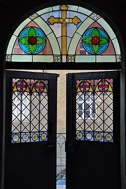 Der aufgesockelte Eingang befindet sich an der Südwand, er ist über eine doppelläufige Treppe erreichbar. Das Rundbogenportal mit bleiverglaster Eisentür aus dem 19. Jahrhundert trägt die Jahreszahl „1622“.