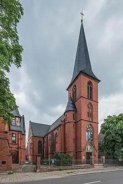 Die geostete Kirche steht an der Bundesstraße 187a, auf dem Grundstück Friedrich-Naumann-Straße 39. Sie entstand nach Plänen des Architekten Arnold Güldenpfennig im Baustil der Neugotik, hat die Grundform eines lateinischen Kreuzes mit einem kreuzbekrönten Turm auf der Westseite.