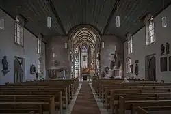 Im Turm hängen vier Glocken im Holzglockenstuhl an Holzjochen.
