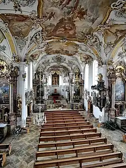 Nach der Unterbrechung durch den Spanischen Erbfolgekrieg erhielt das Langhaus unter Dominikus Zimmermann ab 1712 eine neue Ausstattung. Weitere Veränderungen des Innenraums erfolgten unter Johann Georg Hitzelberger, der ab 1753 die Baumaßnahmen leitete. Es entstanden die heutigen Deckengemälde von Balthasar Riepp und der Stuckdekor von Franz Xaver Feuchtmayer. Auf Initiative des Reichsgrafen Christoph Moritz Fugger von Kirchberg und Weißenhorn nahm Wolfgang Amadeus Mozart am 6. November 1766 in der Kirche an einem Orgelwettbewerb teil.[4][5] In den Jahren 1853/54, 1868/70, 1908 (vermutlich geplant) und 1957/58 fanden weitere Restaurierungsarbeiten statt.