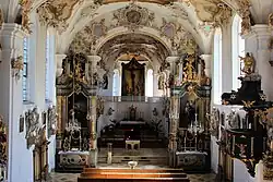 - Die noch erhaltenen Seiten- und Querhausaltäre in Stuckmarmor entwarf Dominikus Zimmermann um 1712/16. Die Altarblätter der Seitenaltäre wurden im 19. Jahrhundert durch die heutigen ersetzt, die Altarbilder im Langhaus werden dem Maler Johann Georg Knappich zugeschrieben.