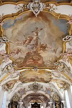 Auf dem Chorfresko wird die Verehrung des Kreuzes durch Engel, Heilige und Menschen aller Erdteile dargestellt. Im Zentrum des Bildes präsentieren schwebende Engel das Kreuz. Daneben sind die beiden Kirchenpatrone, der Apostel Jakobus und der heilige Laurentius, vertreten. Eine weibliche Figur mit Tiara, Papstkreuz und Kelch symbolisiert die Kirche. Auf der oberen Bildhälfte thront die Dreifaltigkeit, auf der unteren Bildhälfte umgeben die Allegorien der vier Erdteile die Weltkugel.