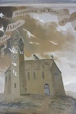 - Zwei Gemälde erinnern an den Pfarrer Ulrich Zusemschneider, der 1632 während des Dreißigjährigen Krieges den Tod fand, eines an der westlichen unteren Emporenbrüstung und ein großes Wandgemälde mit Inschrift an der rechten Wand gegenüber dem hinteren Seitenaltar.[6]