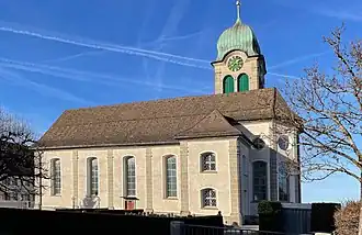 Das Gotteshaus ist eine grosszügige Saalkirche mit polygonalem Chor im Osten. An den Chor ist ein von weither sichtbarer Turm mit Zwiebelhaube angebaut. Die verputzten Fassaden werden durch Pilaster aus Sichtmauerwerk gegliedert.