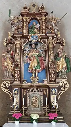 Der barocke Hochaltar steht in der Apsis. Das Werk entstand um 1660/70. Die Hauptfigur zeigt den hl. Jakobus, seitlich stehen die hll. Markus und Katharina. Die Statuen entstanden wohl in der Weilheimer Werkstatt Sebastian Deglers.