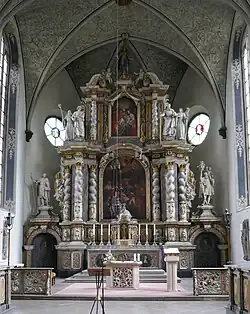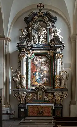 Die Kanzel ist an der Tür zum Aufgang mit 1722 bezeichnet. Die Wurzel- und Ebenholzimitationen werden durch verschiedenartige Holzlasuren erreicht.[7] Am südlichen Pfeiler des Mittelschiffes steht in einem prachtvollen barocken Gehäuse eine spätgotische Pietà. Der Sockel des Gehäuses wird von einem geflügelten Cherub gestützt. Aus der bekrönenden Urne schlagen Flammen.[9]