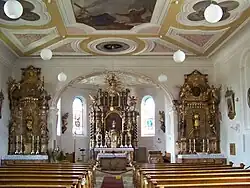 Langhaus und Chor sind mit Flachdecken überspannt. Der um 1720 gebaute Hochaltar stammt aus einer abgerissenen Kirche in Windberg. Er wird von den Skulpturen der Wetterheiligen Johannes und Paulus flankiert.