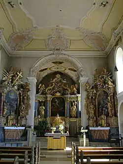 Zur Kirchenausstattung gehört ein Hochaltar, dessen Altarretabel mit der Kreuzabnahme bemalt ist. Die Orgel mit 21 Registern, drei Manualen und einem Pedal wurde 1973 durch Norbert Krieger erweitert.[1]