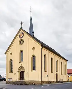 Die Kirche präsentiert sich als Saalbau. Sie ist genordet und schließt mit einem polygonalen Chor ab. Im Nordwesten schließt der Turm an das Gotteshaus an, der das älteste Element des Baus darstellt. Er wurde bereits im Jahr 1607 fertiggestellt und schließt mit einem Echter-Spitzhelm ab. Langhaus und Chor entstanden im Jahr 1872 im Stile der Neugotik. Die Kirche wird auf beiden Seiten von fünf schlichten Spitzbogenfenstern durchlichtet.