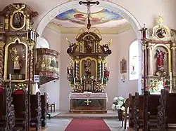Chor und Langhaus werden von einer Flachdecke über einer Hohlkehle überspannt. Den Übergang zwischen Chor und Schiff vermittelt ein korbbogiger Chorbogen. Im rückwärtigen Bereich des Langhauses ist eine stützenlose Orgelempore mit gerader Brüstung eingezogen.[1]