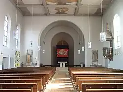 Das Wachstum der Pfarrei erforderte im 19. Jahrhundert eine weitere Vergrößerung. Die Erweiterungspläne scheiterten jedoch an der Finanzierung.[7] 1854/55 fiel unter der Amtszeit des Pfarrers Wilhelm Zwirg die Entscheidung auf einen Neubau im neuromanischen Stil unter Einbeziehung des älteren Turms, nach den Plänen des Architekten Georg von Stengel, mit dem weitgehenden Abriss des Vorgängerbaus. Dieser wurde am 29. September 1864 von Bischof Pankratius von Dinkel geweiht. Die Ausmalung der Wände übernahm der Maler Joseph Kober. 1897 zählte die Pfarrei 948 Katholiken. Bis 1916 stieg die Zahl auf 2200.