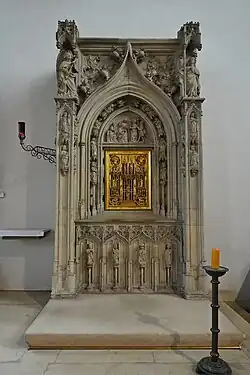 Der erhaltene Altarschrein ist ein aus Eichenholz geschnitztes Mittelteil eines Wandelaltars. Scharniere an beiden Seiten des Schreins zeigen, dass es sich ursprünglich um einen Flügelaltar gehandelt haben muss, die Flügel fehlen jedoch seit unbestimmter Zeit. Die geschnitzten Figuren waren vermutlich ursprünglich farbig, sind jedoch inzwischen ungefasst. Die aus kräftigen Eichenbohlen geschaffenen Reliefs sind von großer plastischer Wirkung.