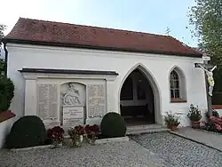Friedhofskapelle mit Kriegerdenkmal (links) und Missionskreuz (rechts)