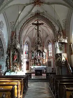 Das Kircheninnere wird von einem spätgotischen Netzrippengewölbe mit spitzen Schildbögen überspannt, welches auf Wandpfeilern mit Rundstabprofilen ruht. Die Rundstäbe gehen oberhalb von halben Achteckskapitellen in die Gewölberippen über. Im Seitenschiff sind die Kapitelle halbrund ausgeführt und mit Blattwerk verziert. Auch der spitze Chorbogen zeigt an den Kanten beiderseits Rundstabprofile. Die Orgelempore wird von zwei achteckigen Stützpfeilern getragen, deren quadratische profilierte Kämpfer übereck gestellt sind. Außerdem sind diese wie auch die Schlusssteine des Gewölbes mit Wappen besetzt. Der Raum unterhalb der Empore ist ebenfalls von einem Netzgewölbe überspannt und öffnet sich mittels dreier Stirnbögen zum Hauptschiff.[2]